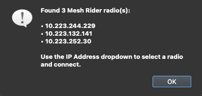 - Scan: This feature will attempt to scan the 10.223.x.x subnet for Mesh Rider radios. Please note this requires your network settings to be on the 10.223.x.x subnet.