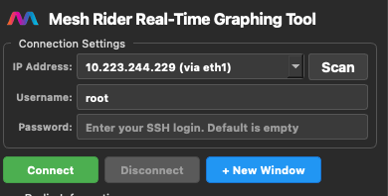The Mesh Rider Real-Time Graphing Tool is a cross-platform application that allow users to monitor the link state of the connected radio. This tool is a real time graphing equivalent of the link status logs. The tool supports Windows(x86_64,ARM), macOS (ARM) and Ubuntu (x86_64).