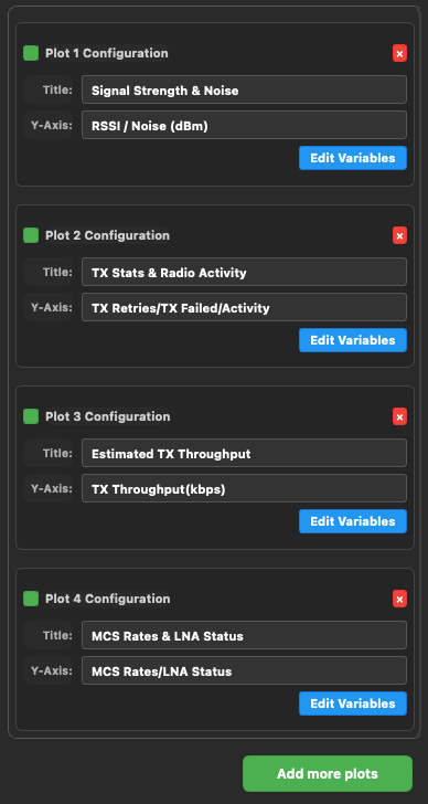The application starts with default plots with most useful metric in range testing with Mesh Rider radios.