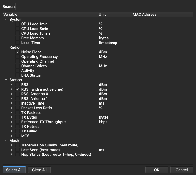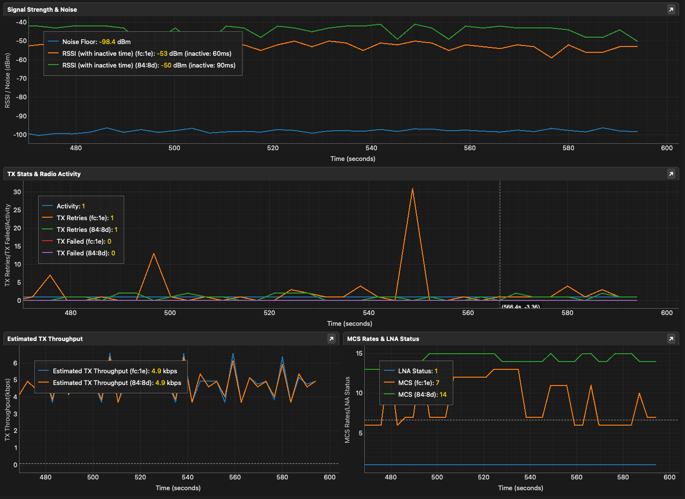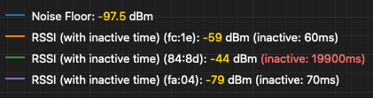 Inactive Time - this is the time since a packet was last received from that station. This is only displayed on the legend with the RSSI. When the inactive time for any station exceeds 10 seconds, the graphing tool will mark that station's inactive time as red. This is a sign that the current readings for that station are stale and cannot be trusted.