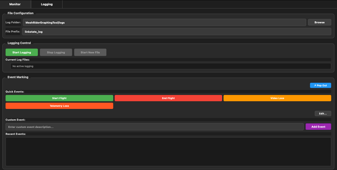 To start logging click the Start Logging button. The log will automatically append the hostname of the radio to the logfile. Currently the logging tool creates two log files, one is labelled raw which is a reflection of the data it is receiving from the radio and the other is labelled enhanced which incorporate the raw data with support for event markings. Both should be compatible with the Mesh Rider Log File viewer.