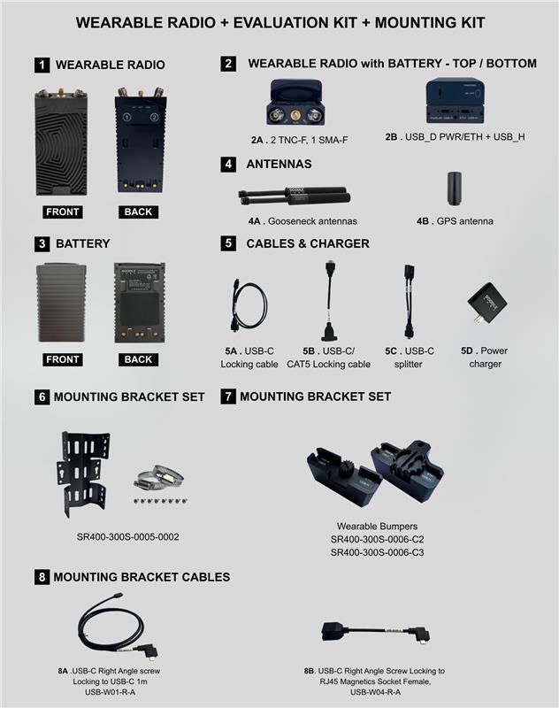 - Wearable Mesh Rider Radio: Compact with TNC-F connectors, suitable for mobile or personnel-worn applications. The kit includes a dedicated battery, antennas, and locking cables.
