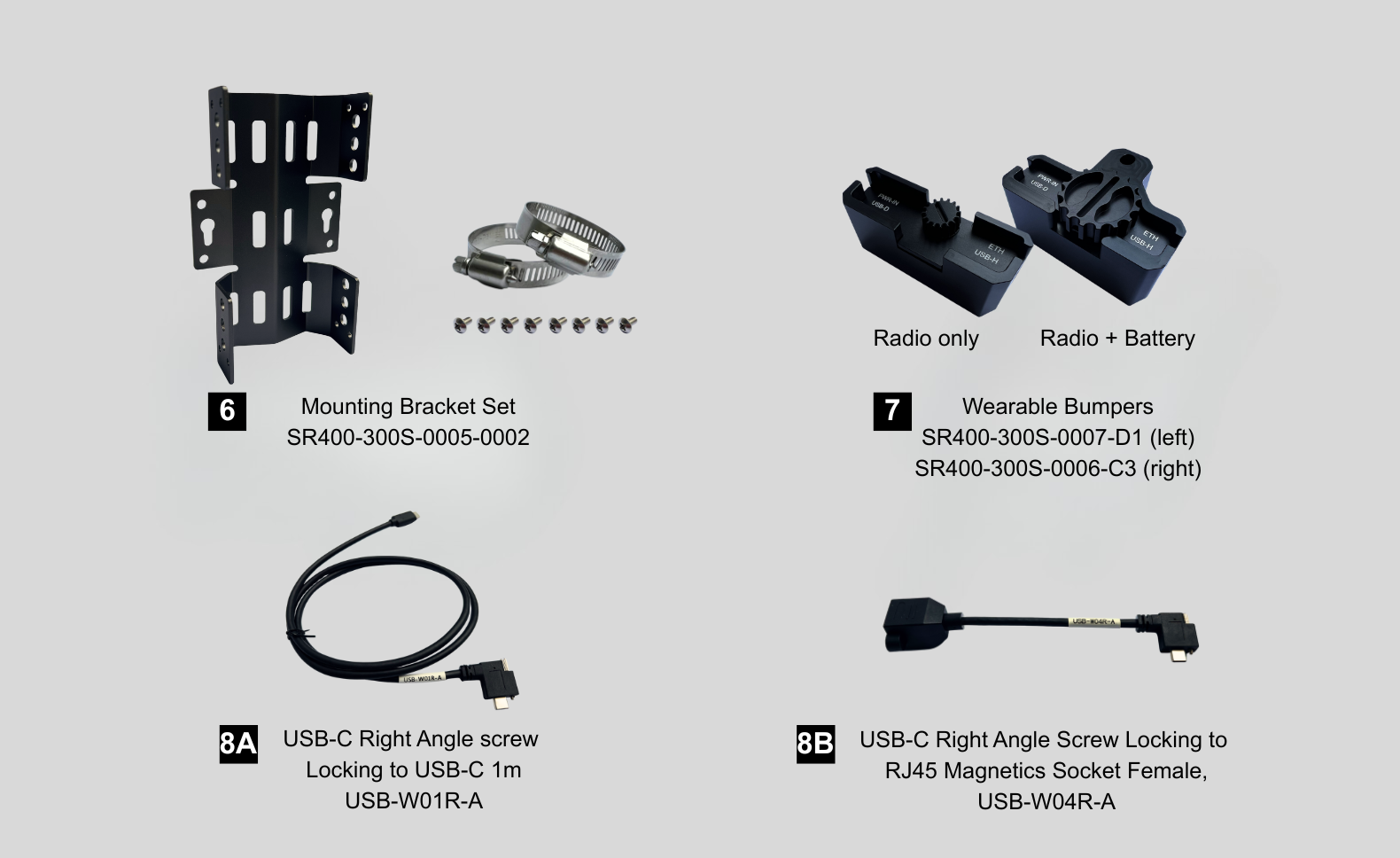 B) 1x Radio + Battery Bumper (SR400-300S-0006-C3) (confirm PN if C2/C3) - 8.Mounting Bracket Cables